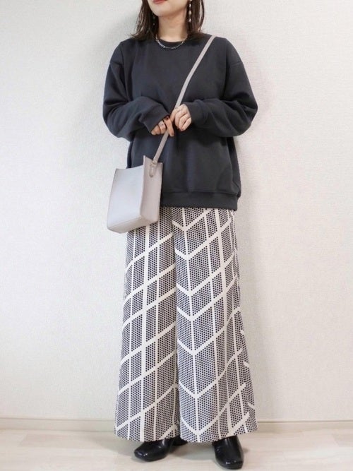 春もスウェットが大活躍。ちょっぴり個性的なボトムは、シンプルなスウェットを合わせて引き算するとバランスが整います。