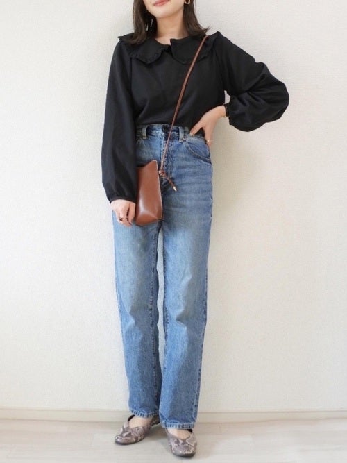 ガーリーなビッグカラーブラウスは、デニムパンツを合わせて甘さ控えめに着るのがおすすめ。