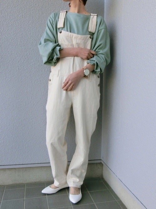 淡いベージュのサロペットにグリーンのトップスを合わせることで、メリハリの効いた春らしいカラーバランスに。