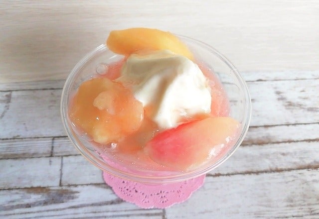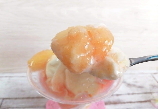 口にしてみれば、半分凍った桃がシャリシャリして、でも口の中でだんだんとろける食感になっていくんです♡