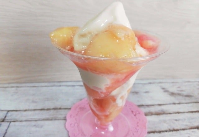 完熟した白桃を、思う存分食べられるミニストップの『完熟白桃パフェ』。