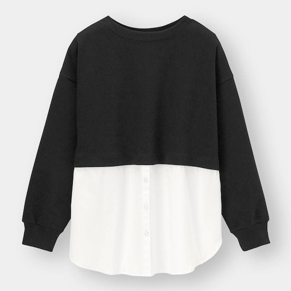 GU「ダブルフェイスヘムコンビネーションプルオーバー」は、カジュアルなスウェットと、クールなシャツをドッキングさせたコンビネーションアイテムです。
