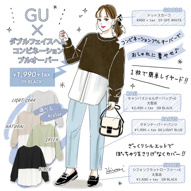 簡単にトレンドを取り入れられる「ダブルフェイスヘムコンビネーションプルオーバー」は、LIGHT GRAY、BLACK、NATURAL、GREENの4色展開。