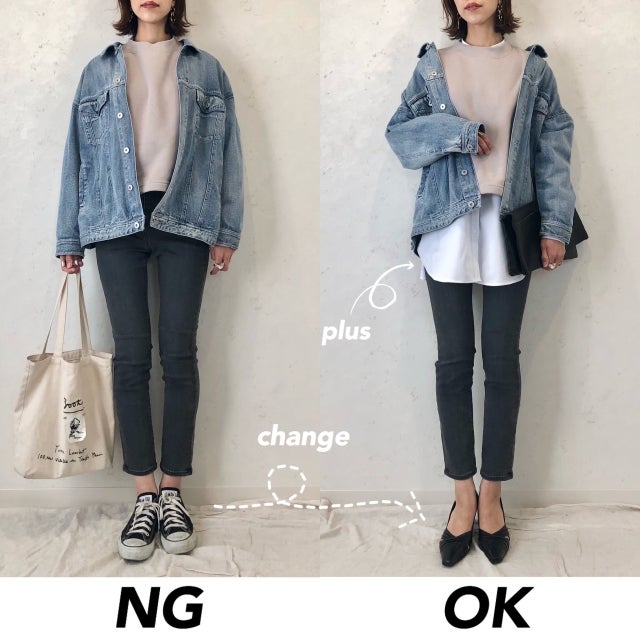 こちらを使ってNGコーデを変身させます。インナーに白シャツをプラスし、足元をヒールに変更。