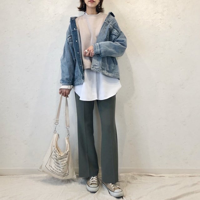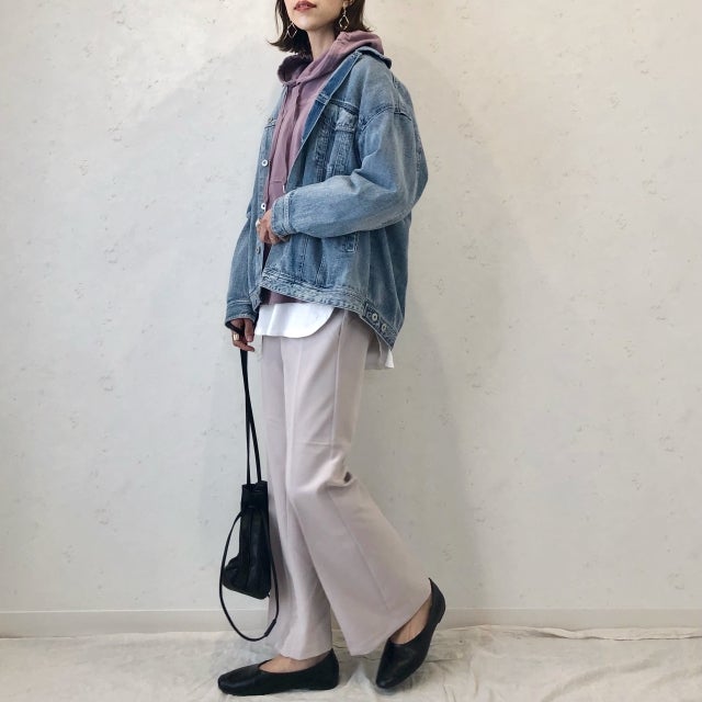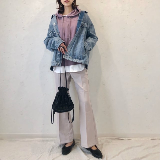 デニジャケとパーカーの組み合わせはカジュアルになりがちですが、フレアパンツに変えたことで、今年らしく女性らしいコーデにも変えられます。