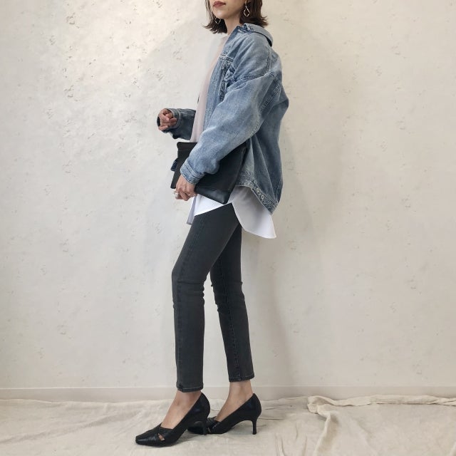 シャツからのぞくスキニーの脚のラインは女性らしさがあがりますね。丈の長いシャツなので、太腿周りも隠れて細見えに。ヒールを履くことで脚長効果も◎