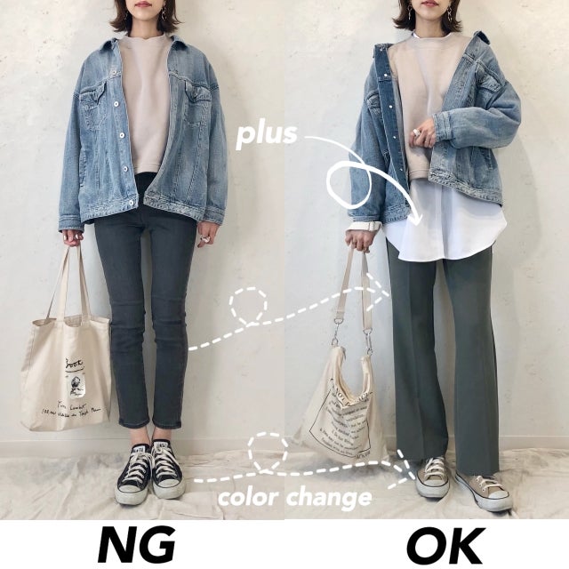 トップスもパンツも今年らしいくすみカラーなので、レイヤードの白を入れなければ上下同系色の寸胴スタイルになってしまうため注意!
