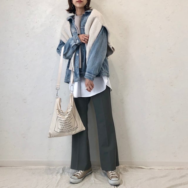 こちらは上のコーデにプラスワンでニットを肩掛けに。少し肌寒い時にも暖かく、見た目も上級者に。