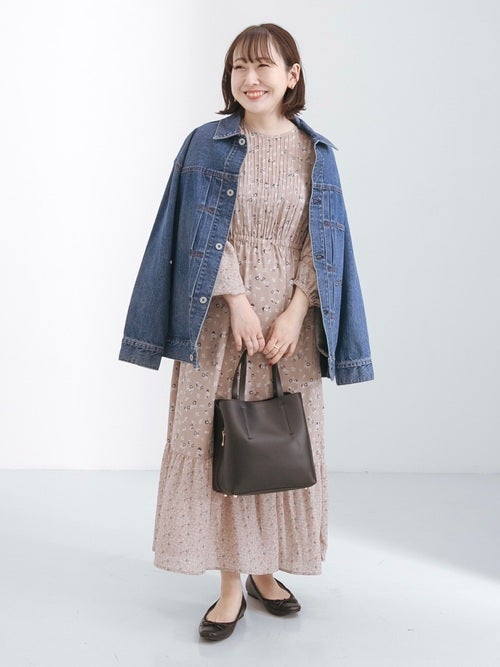 デニムジャケットを、フェミニンワンピースと合わせたMIXスタイル。