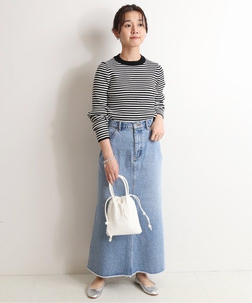 ボーダー×デニムの鉄板コーデも細めピッチボーダーとスカートで、こんなに女性らしい着こなしに。
