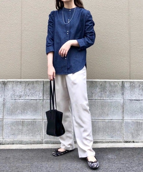 旬なスタンドカラーシャツも、デニムならカジュアルでこなれた印象になりますね。
