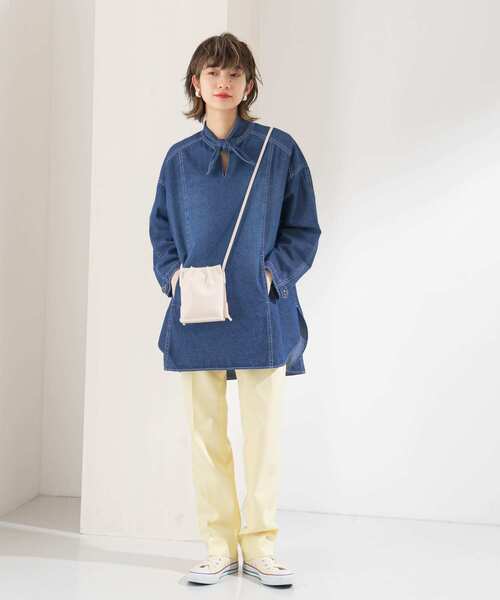 首元のボウカラーがかわいらしい、大人かわいいデニムブラウスコーデ。