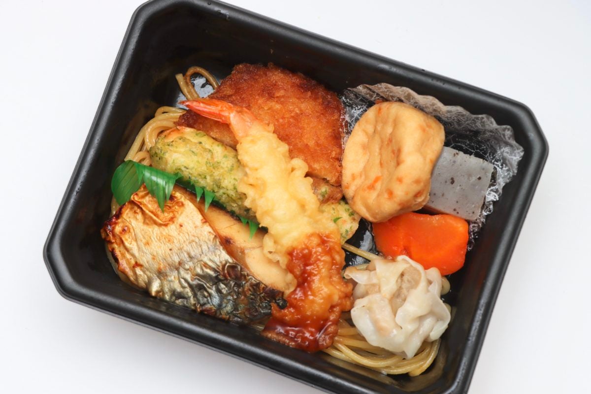 この商品だが、焼き鯖、海老天、コロッケ、ちくわ天といったご飯をかきこめる系のおかずと、煮物やシュウマイなど箸休めにぴったりのおかずも入っている。その下には量こそ少ないが和風パスタが敷いてあり、品数としてはなかなかだろう。