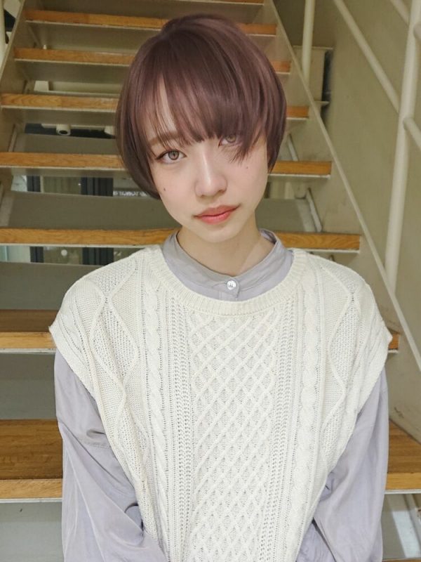 スモーキーでやわらかな髪色の効果で、大人女性のショートヘアがぐっとしなやかな雰囲気になります。