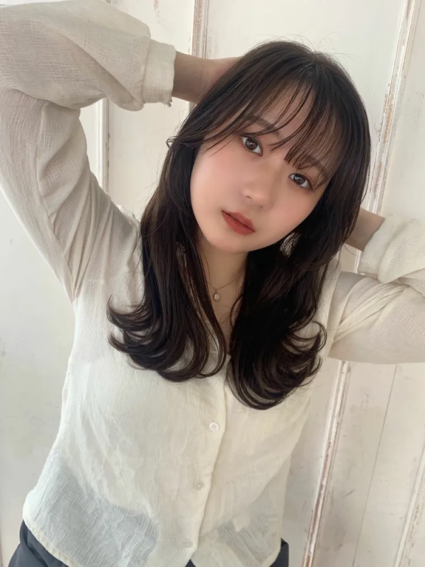 毛先にレイヤーを入れたミディアムヘアに暗めのショコラブラウンの組み合わせは、毛先の隙間から見える肌がきれいに映えるヘアスタイルが作れますよ。