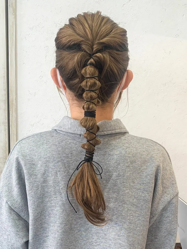 黒い紐を巻き付けると毛束をきっちりとまとめられるので大人女性のオフィスヘアにもピッタリですよね。