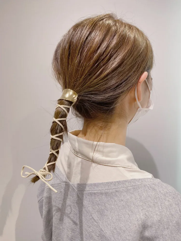 ストレートのローポニーテールに人気の紐を巻き付けるだけで、おしゃれ度がぐっとアップします。