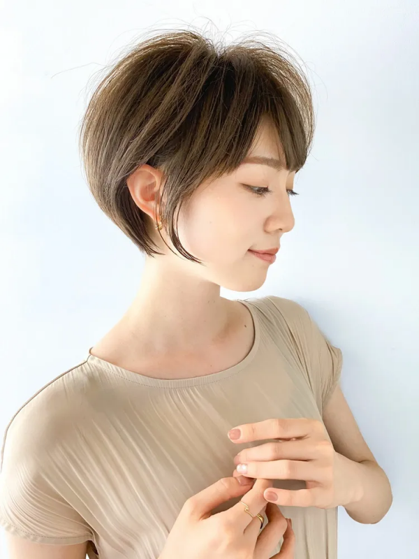 キュートな雰囲気になりやすいショートボブも前髪なしのストレートなら、大人っぽい雰囲気を簡単に作れてオフィススタイルにぴったり。
