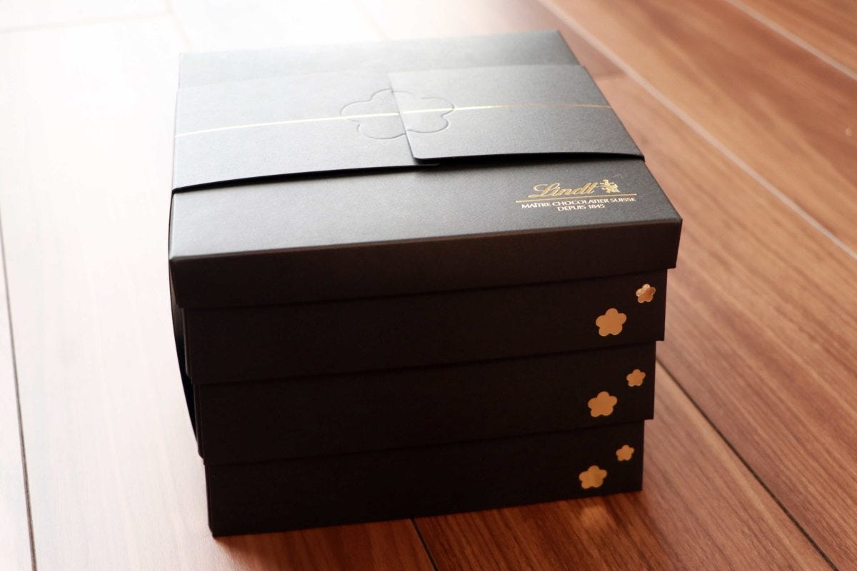 そう、あの美味しいチョコレート「リンドール」でおなじみのリンツが、まさかの三段重を発売しているんです。価格は送料込み8,900円。なかなかいいお値段だ。
