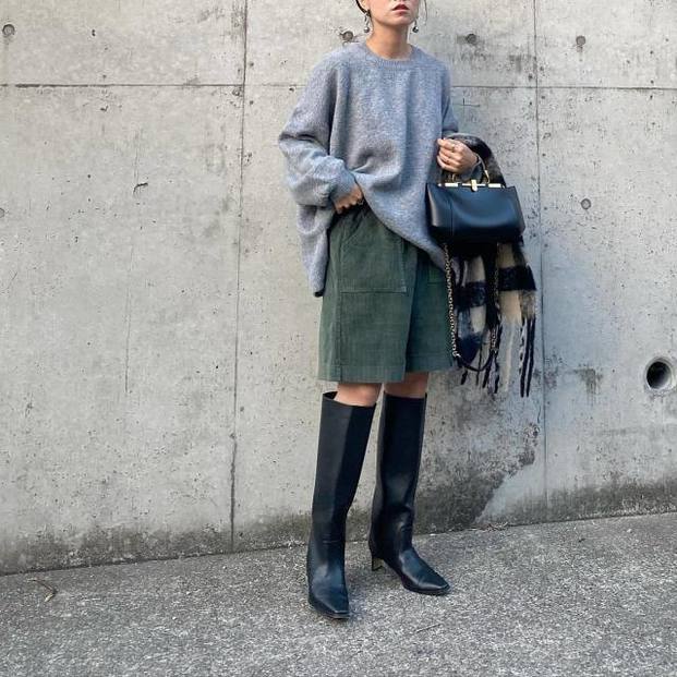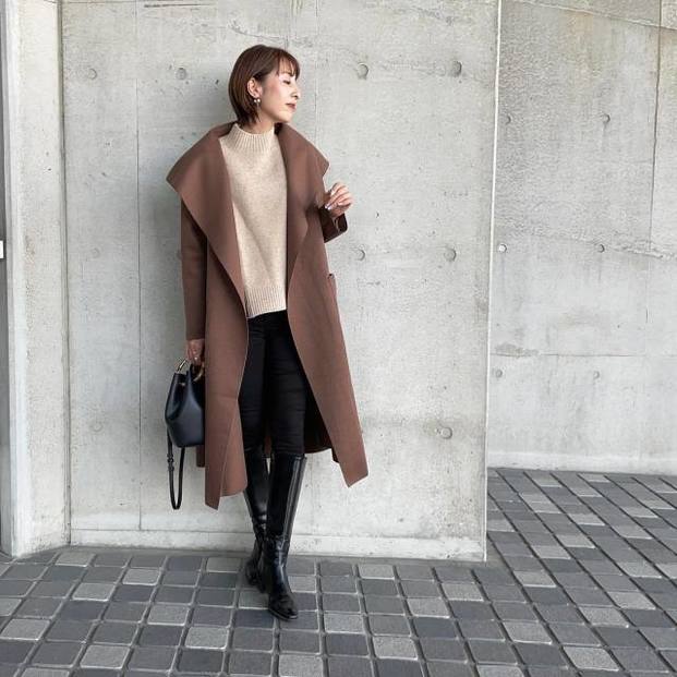 ロングブーツといえば、黒のスキニーパンツをブーツインで合わせるのが王道のスタイル。すっきり感があるから、きれいめな印象で着こなせます。