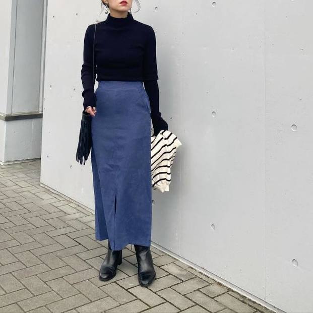 今年は深みのあるブルーカラーに注目。スカートで取り入れるだけで、おしゃれ上級者見えが叶いますよ。