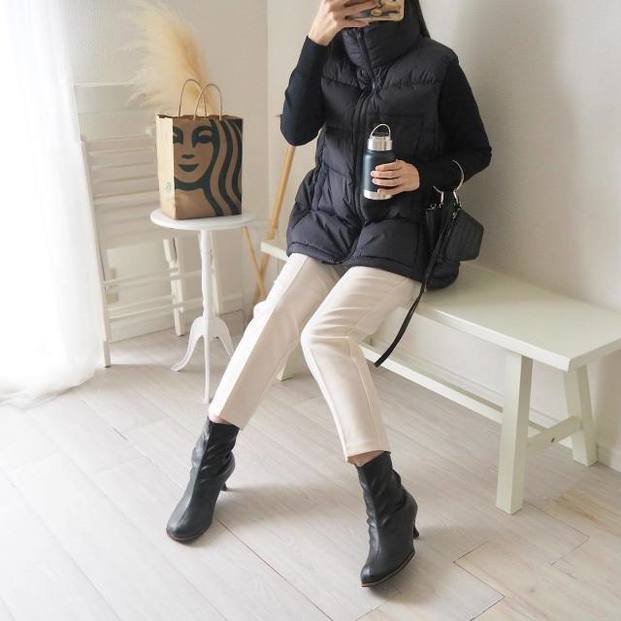 スニーカーよりも黒ブーツを合わせることでほんのりフェミニンに仕上がり、大人可愛い雰囲気に傾きます。