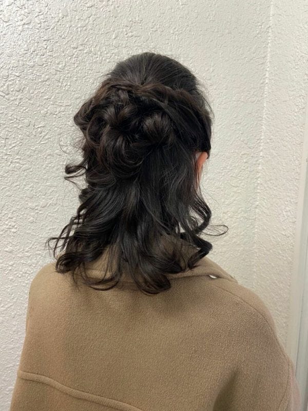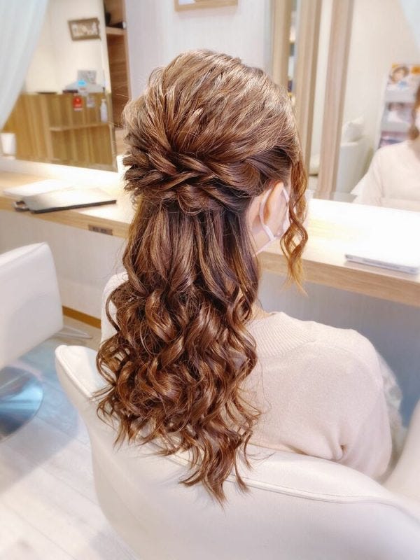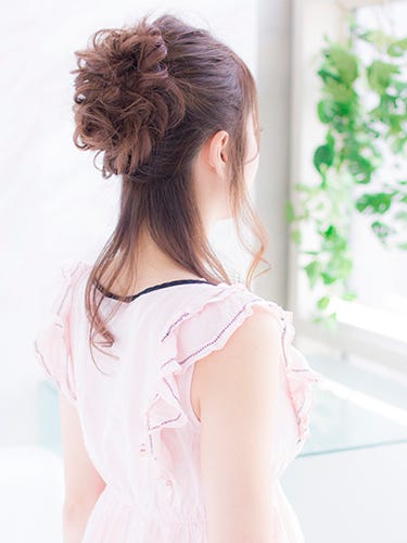おろしたダウンスタイルの部分は、コテやヘアアイロンでくるくると巻きを入れると、よりおしゃれなもこもこの髪型になります。