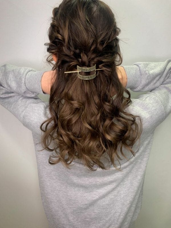 こちらは、左右の毛束を編み込みながらまとめています。編み込んだ髪は、ゆるくほぐして人気のダウンスタイルに。
