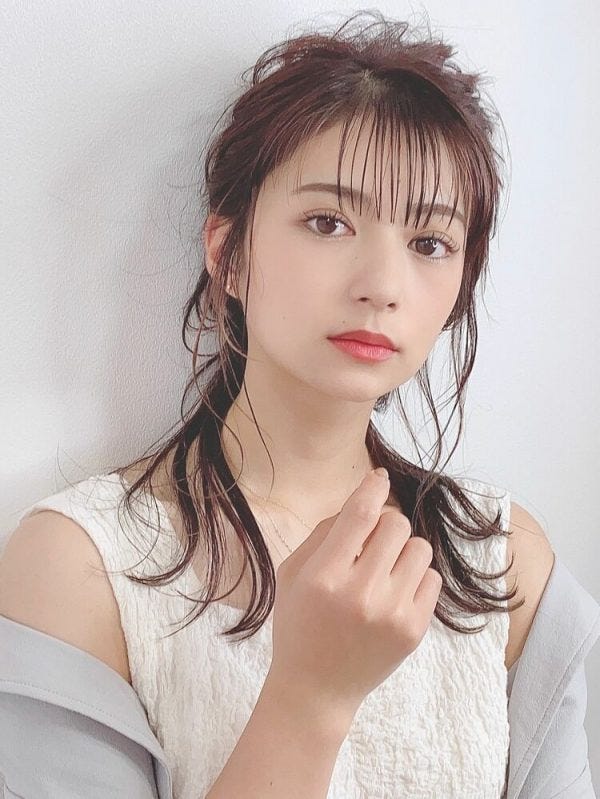 トレンドのシースルーバングで額を見せ、大人っぽい知的差もアピールできます。髪の半分を結ぶだけの、簡単にできるゆるふわアレンジです。