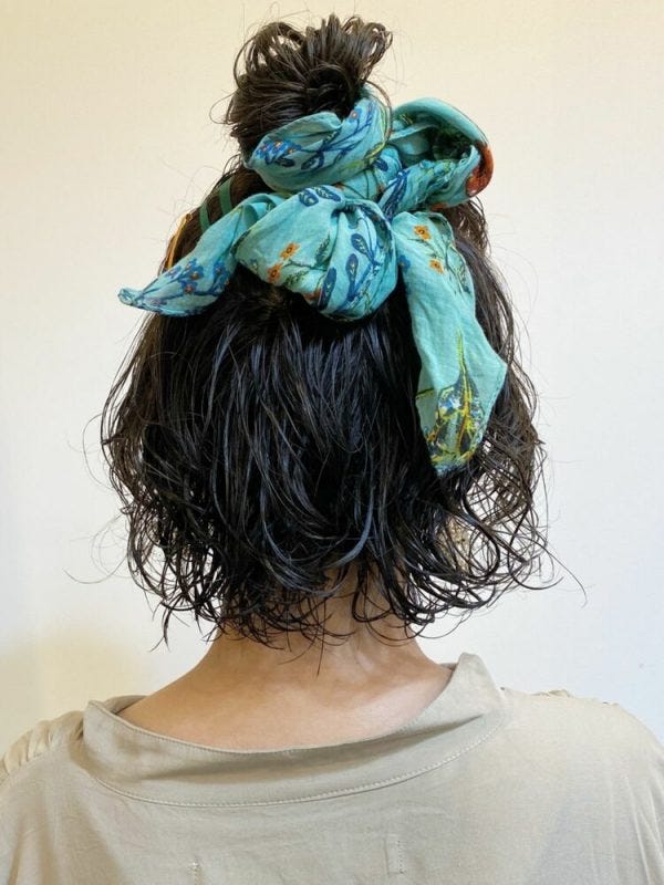 トレンドのスカーフをくるくると巻き付けるだけでOKです。