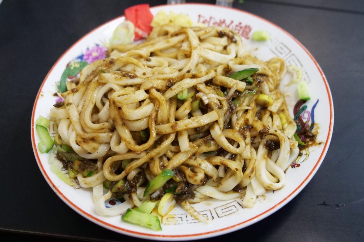 こちらが白龍のじゃじゃ麺。うどんのような麺を12〜15分を茹でるため、コシはなくかなり柔らかい歯ごたえ。麺は注文が入ってから茹でられるため、着丼まではラーメンなどより少し時間がかかると思っておいたほうがいい。