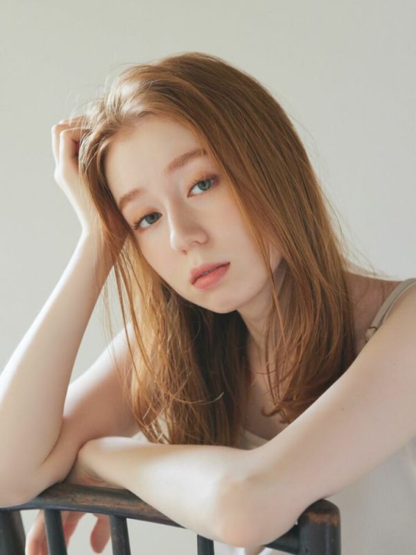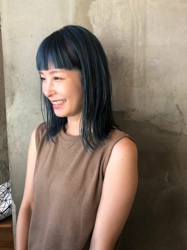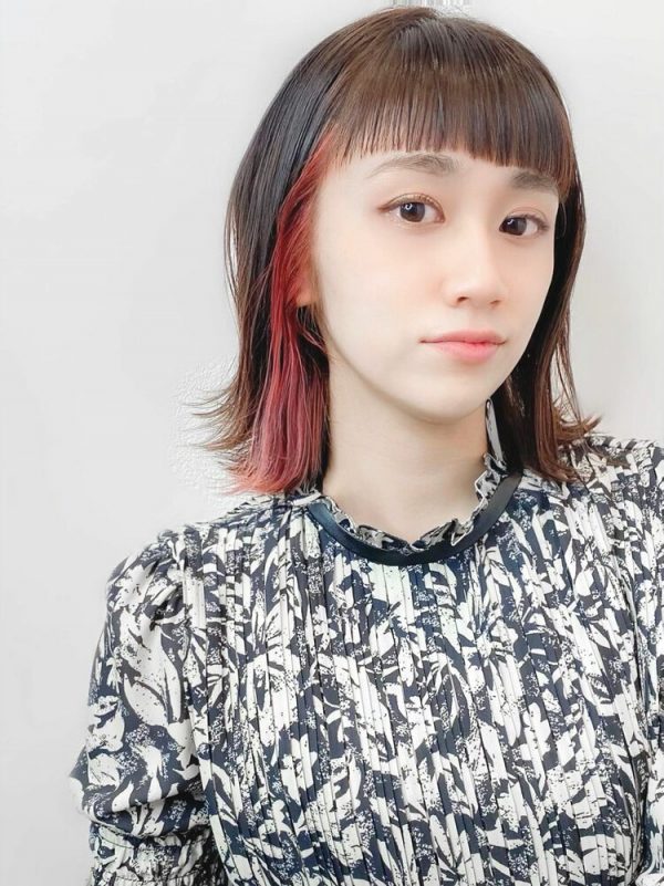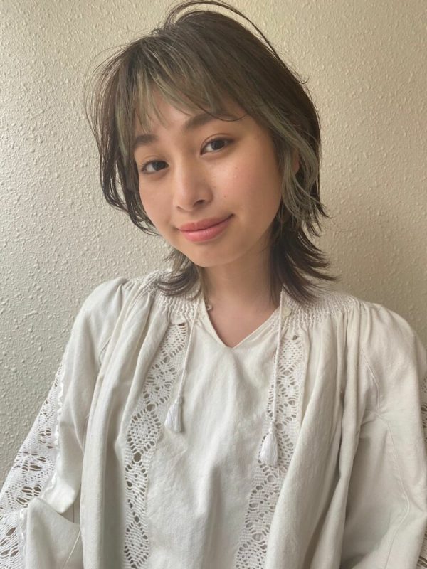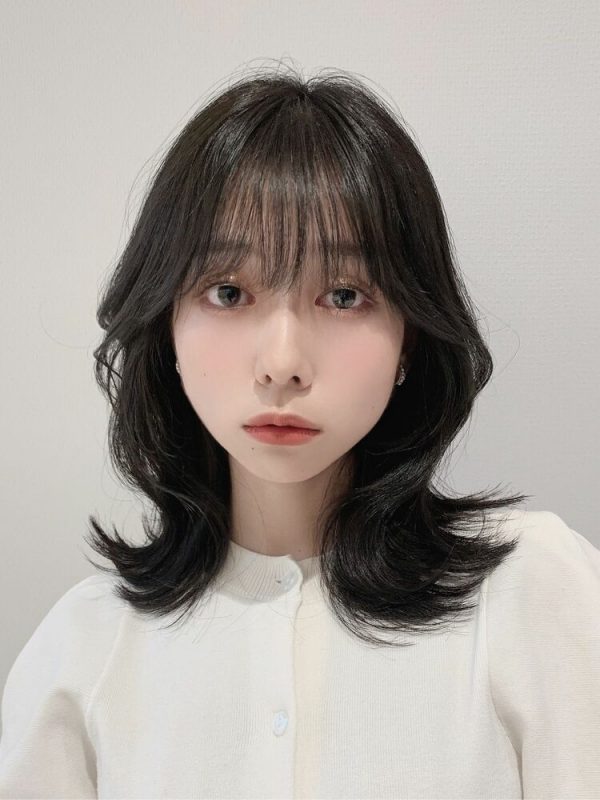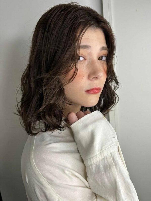 動きが出るようにレイヤーカットが施されたミディアムの髪型は、重たくなりがちな髪型を軽やかで繊細に見せています。