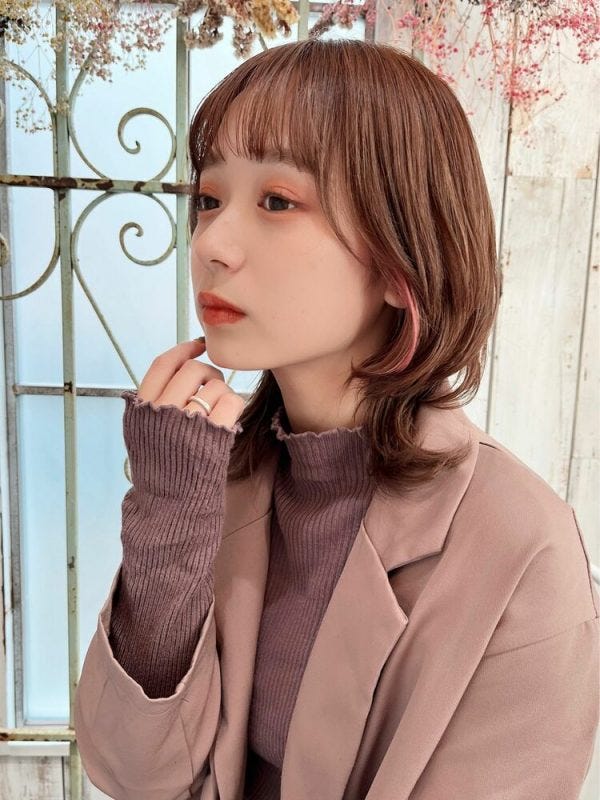 こちらは、レトロで人気のミディアムウルフに、同じく人気の高いインナーカラーを組み合わせた、最先端な春っぽミディアムウルフです。