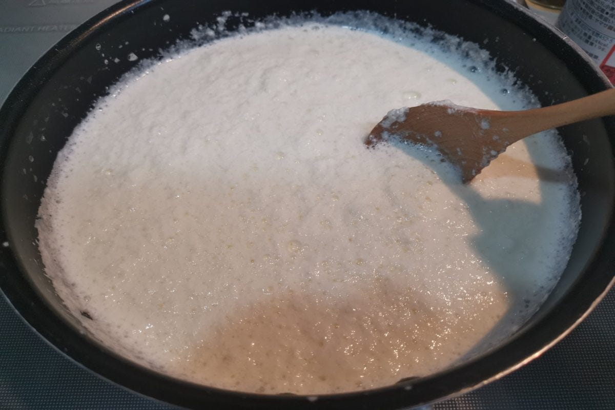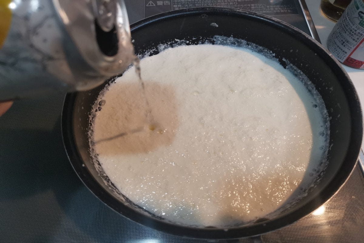 作り方は簡単で、牛乳を温めながらストロングゼロダブルレモンを徐々に入れていき混ぜ、同量ぐらいになったら少し放置して分離させる。
