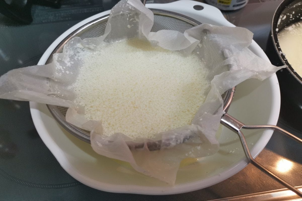 その後はざるにキッチンペーパーを敷いて濾し、最後に搾れば完成。搾り方を強くすれば普通のカッテージチーズ風に、弱ければストロングゼロ感強めになる。