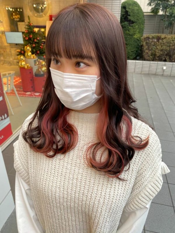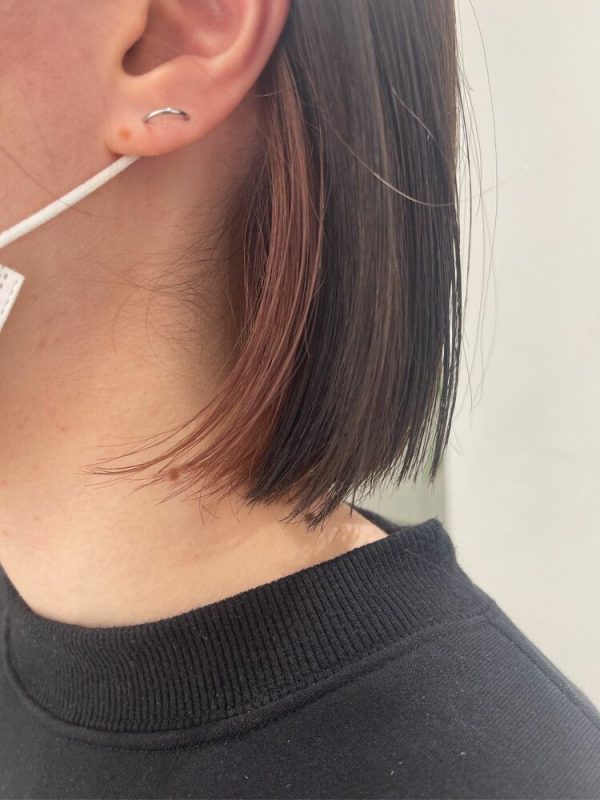 こちらはチョコレートブラウンにピンクのイヤリングカラーを合わせたヘアスタイルです。