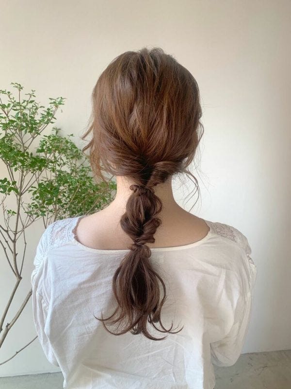 結び目は細く取った毛束を巻き付けてヘアゴムが見えないようにすると、おしゃれ度がアップしますよ。