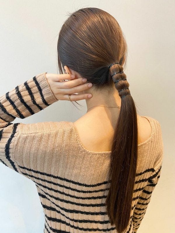 ただ、シンプルなポニーテールだと物足りないので一つ結びした後に二つに分けて結び、さらに一つにまとめるというちょっとした技を使って簡単におしゃれ見えを叶えましょう。