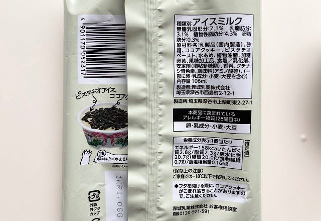 乳製品やピスタチオペースト、ココアクッキー、水あめなどが使われています。