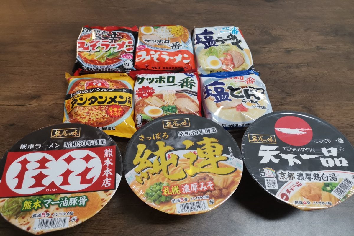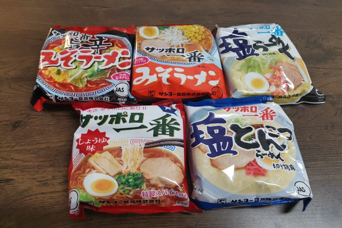 まず目を引いたのは、定番の醤油や塩、みそだけでなく辛味噌や塩とんこつまで網羅した、サッポロ一番の袋麺たち。
