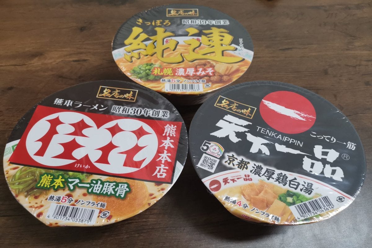 札幌の名店「純連」、熊本ラーメンの老舗「桂花」、京都「天下一品」のカップラーメンが1個ずつ、計3つ入っている。