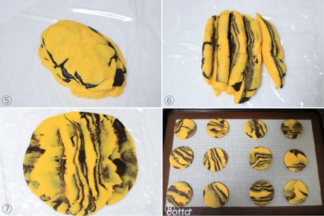 ⑧ 4~5cm程度の丸型でトラ柄模様に見えるよう意識して抜き、残った生地をまとめてさらに抜く。160℃に予熱したオーブンで約18分焼成する。(焼き時間は焼き色を見て各自調整してみて下さい)