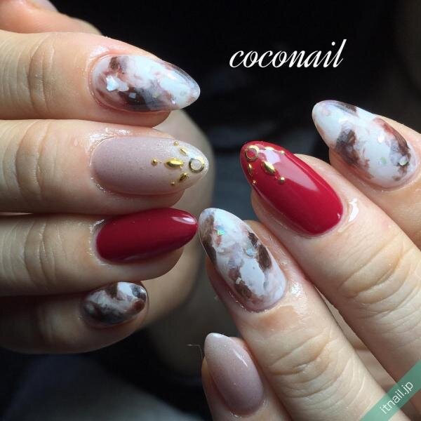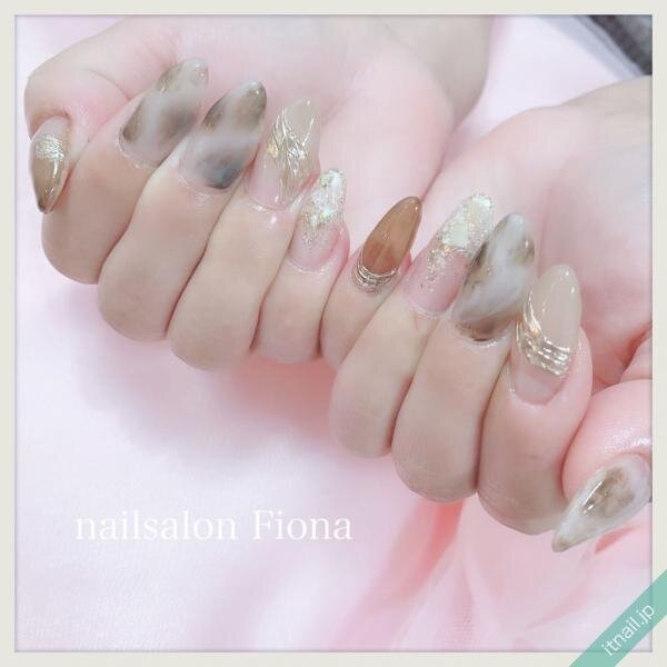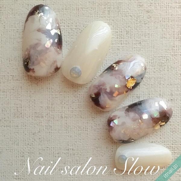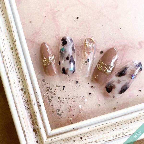 白べっ甲ネイルは、ゴールドアイテムとの相性が抜群です。中でも人気なのは、金箔をのせたデザイン♡一気に華やかさと高級感が増し、大人向けの綺麗めネイルに仕上がります。特別感のあるネイルにしたいときにもおすすめですよ。