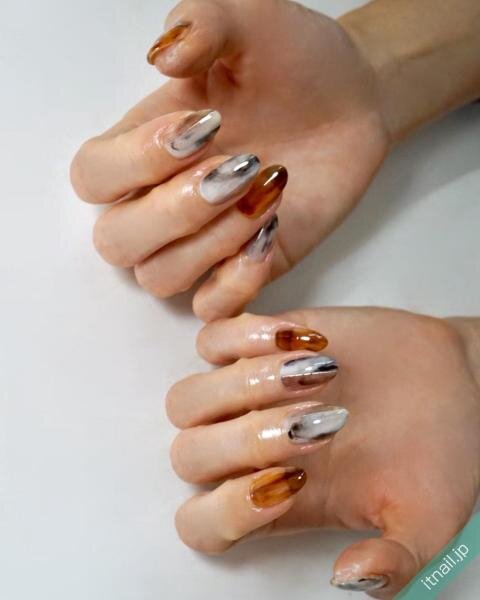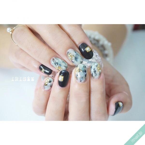 ふんわりした白べっ甲ネイルに、黒のネイルを入れたデザインです。メリハリのあるかっこいい仕上がりになります。ゴールドカラーもより引き立ち、クールでゴージャスな指先が楽しめますよ♪