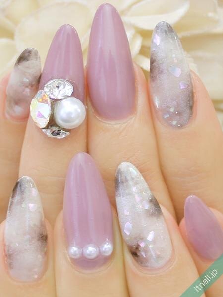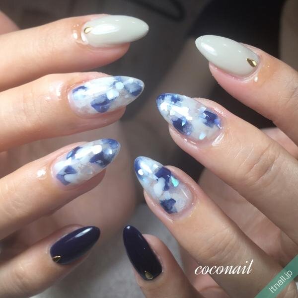 乳白色を使うのも、ふんわりした白べっ甲ネイルにおすすめ♡色が柔らかいので、他の爪もシアーで柔らかい色にすると統一感が出ます。爪の先端にたっぷり入れたシェルも、ジュエリー感があって可愛いですね♡