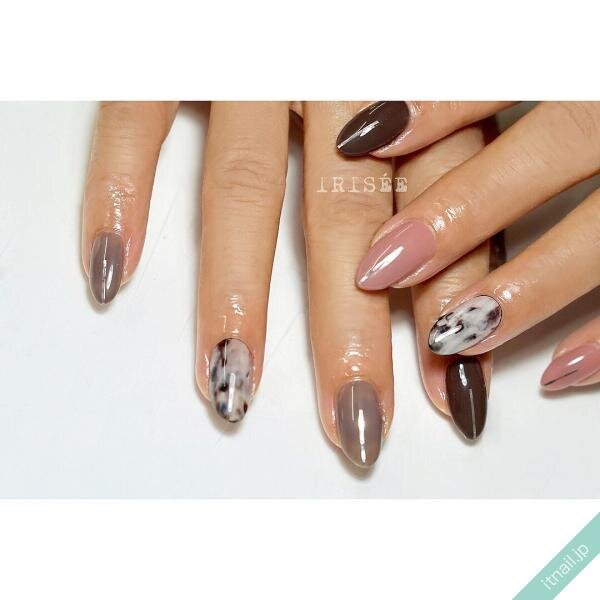ホワイトカラーをベースにふんわりしたブラウンで模様を描けば、定番の白べっ甲ネイルに♡繊細なパールを含むホワイトカラーもおすすめですが、シェルを埋め込むと可愛らしさが増してプリンセス風の仕上がりになりますよ!他の爪はパールやビジューで華やかにするのがおすすめです。
