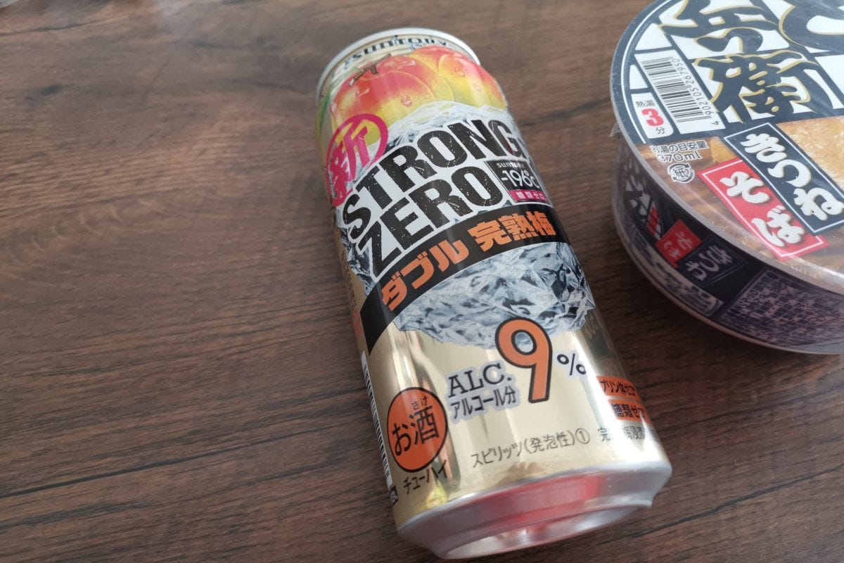 そこで考えたのが、ストロングゼロダブル完熟梅とどん兵衛のきつねそばを合わせる「ストロングどん兵衛」である。