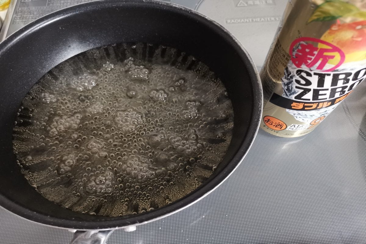 作り方は簡単で、ストゼロを沸かし、どん兵衛にそのまま入れるだけ。こうすることでよりつゆの甘味をプラスしつつ、どん兵衛汁を飲めばそのままストゼロを味わえるという楽ちんなそばにしようというワケだ。