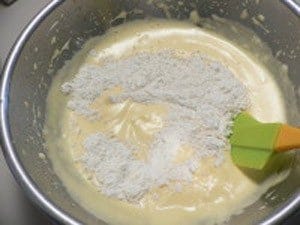 薄力粉を広げ入れ、ゴムベラでさっくり混ぜ合わせる。