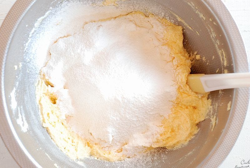 ④ 薄力粉とベーキングパウダーを合わせて振るいながら③に加え、ゴムベラで切るように混ぜる。続けて生クリームも加え、さらに混ぜる。